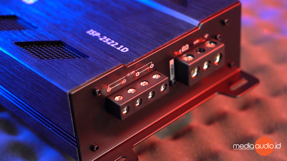 Selanjutnya, kita beralih ke tenaga yang lebih tinggi, ISP-2522.1D. Desainnya slim berbentuk persegi panjang berukuran 34 x 16 x 5.9 cm, Heatsink udah pasti kokoh, karena PCB-nya (Print Circuit Board) double side board. Nantinya akan berpengaruh ke arus listrik, susunan double side seperti ini akan lebih menghemat pemakaian arus. Memiliki daya 1.414 Watt dengan frekuensi response di 8Hz-180Hz, Subsonic Filter di angka 5Hz-50Hz, guna meningkatkan nada bass, amplifier ini memiliki level bass boost di angka 0db-12dB.